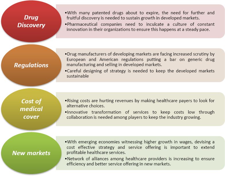 Despite unrelenting cost pressures, changing demographics and increasingly empowered consumers, the healthcare industry remains highly focused in witnessing rapid changes with the expansion of digitization in both provider and payer segments, and consumerization and cost saving initiatives driving the industry. The health care industry is characterized by innovation, significant public and private investment, highly skilled talent, and excellent wages. Cost of healthcare is forcing healthcare providers to redesign plans conducive for growth as the discovery of new drugs is important for pharmaceutical players to survive and generic drugs are driving growth in emerging markets. These changes have forced healthcare organizations to reassess and modernize their current systems as well as develop new business and technology capabilities.