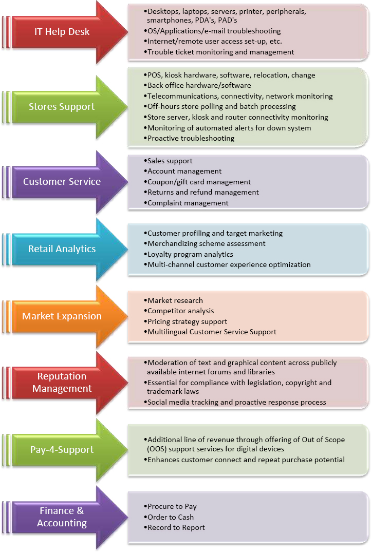 At SPB Corp, we help retailers understand the "voice of the customer," then the customer relationship to prove a high correlation between customer experience and loyalty to evaluate how to enhance their customer interaction models in order to create an emotional bond. Today’s tech savvy shoppers are always well informed and make sure of getting the maximum value out of every penny spent, leading to constant change in their buying behavior. We strive to deliver such a superior shopping experience across customer preferred channels, achieving operational excellence throughout the business processes and empowering employees for customer centric service delivery. We strongly believe that, achieving differentiation, brand enhancement and focusing on the organization for Fast, Efficient, optimized and Flexible operations the core objectives of retail industry. With our extensive experience and relationships with various stakeholders in the retail value chain, we have the unique ability to deliver high-quality solutions that maximize value from internal services transformation, shared services, outsourcing and blended model strategies. Some of the hot competences we deliver to our retail customers include: